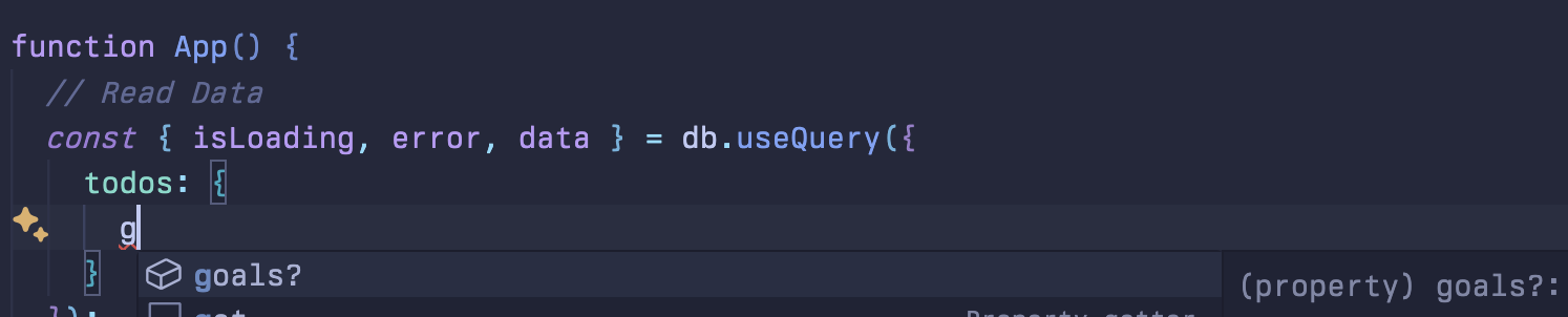 const query = { todos: { goals: {}, }, }; const { isLoading, error, data } = db.useQuery(query);