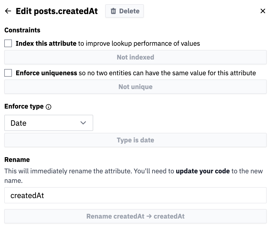 You'll see a modal that you can use to rename the attribute, index it, or delete it: